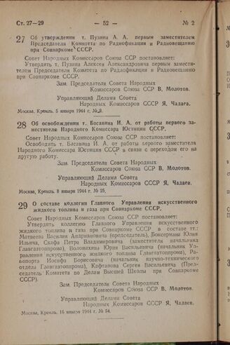 Об освобождении т. Басавина И. А. от работы первого заместителя Народного Комиссара Юстиции СССР. Постановление Совета Народных Комиссаров Союза ССР. 8 января 1944 г. № 25
