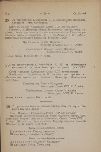 Об утверждении т. Яговкина И. В. заместителем Народного Комиссара Путей Сообщения. Постановление Совета Народных Комиссаров Союза ССР. 31 января 1944 г. № 103