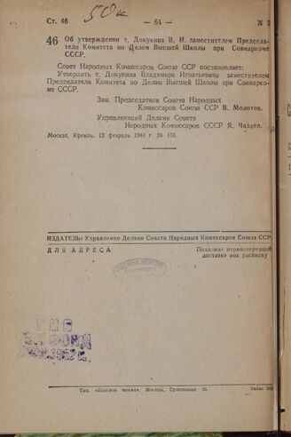 Об утверждении т. Докукина В. И. заместителем Председателя Комитета по Делам Высшей Школы при Совнаркоме СССР. Постановление Совета Народных Комиссаров Союза ССР. 12 февраля 1944 г. № 156