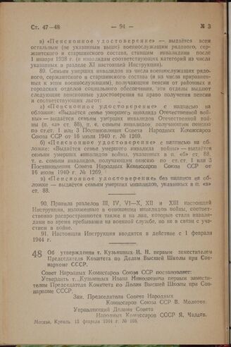 Об утверждении т. Кузьминых И. Н. первым заместителем Председателя Комитета по Делам Высшей Школы при Совнаркоме СССР. Постановление Совета Народных Комиссаров Союза ССР. 15 февраля 1944 г. № 168