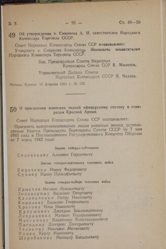Об утверждении т. Смирнова А. И. заместителем народного Комиссара Торговли СССР. Постановление Совета Народных Комиссаров Союза ССР. 15 февраля 1944 г. № 170