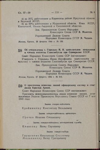 О присвоении воинских званий офицерскому составу и генералам Красной Армии. Постановление Совета Народных Комиссаров Союза ССР. 2 марта 1944 г. № 227