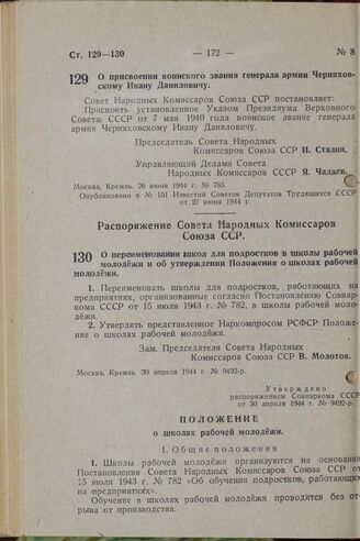 О присвоении воинского звания генерала армии Черняховскому Ивану Даниловичу. Постановление Совета Народных Комиссаров Союза ССР. 26 июня 1944 г. № 783