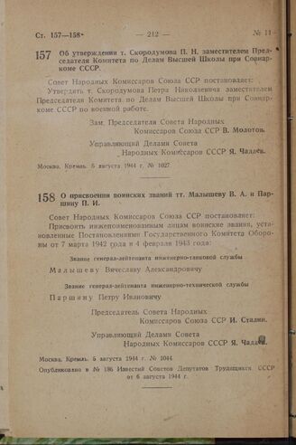 Об утверждении т. Скородумова П. Н. заместителем Председателя Комитета по Делам Высшей Школы при Совнаркоме СССР. Постановление Совета Народных Комиссаров Союза ССР. 5 августа 1944 г. № 1027