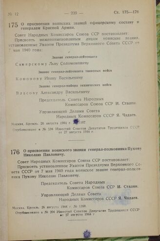 О присвоении воинских званий офицерскому составу и генералам Красной Армии. Постановление Совета Народных Комиссаров Союза ССР. 26 августа 1944 г. № 1167