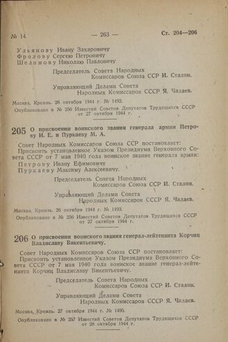 О присвоении воинского звания генерала армии Петрову И. Е. и Пуркаеву М. А. Постановление Совета Народных Комиссаров Союза ССР. 26 октября 1944 г. № 1493