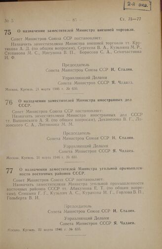 Постановление Совета Министров СССР. О назначении заместителей Министра угольной промышленности восточных районов СССР. 22 марта 1946 г. № 635