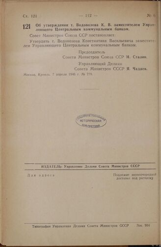 Постановление Совета Министров СССР. Об утверждении т. Водовозова К.В. заместителем Управляющего Центральным коммунальным банком. 7 апреля 1946 г. № 779