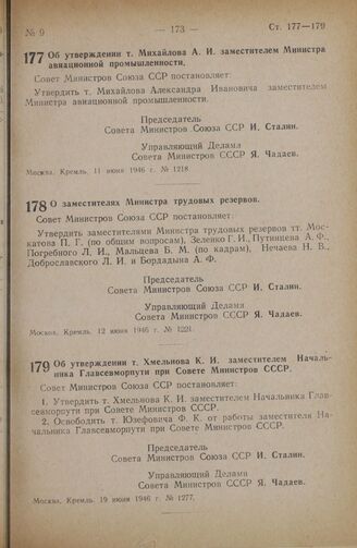 Постановление Совета Министров СССР. Об утверждении т. Михайлова А.И. заместителем Министра авиационной промышленности. 11 июня 1946 г. № 1218