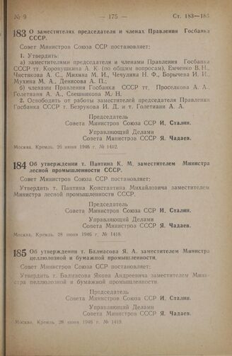 Постановление Совета Министров СССР. Об утверждении т. Пантина К.М. заместителем Министра лесной промышленности СССР. 28 июня 1946 г. № 1418