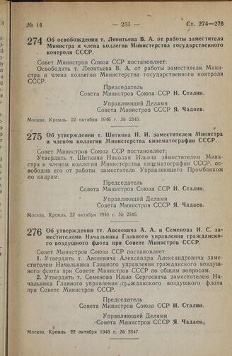 Постановление Совета Министров СССР. Об освобождении т. Леонтьева В.А. от работы заместителя Министра и члена коллегии Министерства государственного контроля СССР. 22 октября 1946 г. № 2345
