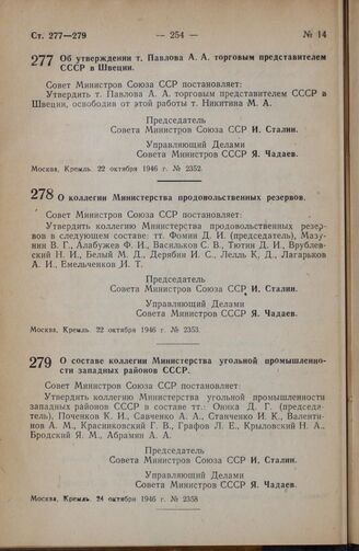 Постановление Совета Министров СССР. Об утверждении т. Павлова А.А. торговым представителем СССР в Швеции. 22 октября 1946 г. № 2352