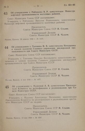 Постановление Совета Министров СССР. Об утверждении т. Рябчикова В.Р. заместителем Министра нефтяной промышленности восточных районов. 26 апреля 1948 г. № 1414