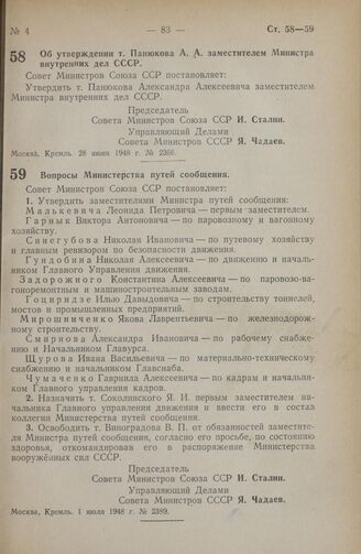 Постановление Совета Министров СССР. Об утверждении т. Панюкова А.А. заместителем Министра внутренних дел СССР. 28 июня 1948 г. № 2366