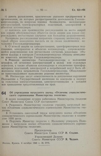 Постановление Совета Министров СССР. Об учреждении нагрудного значка «Отличник социалистического соревнования Министерства геологии». 4 октября 1948 г. № 3775