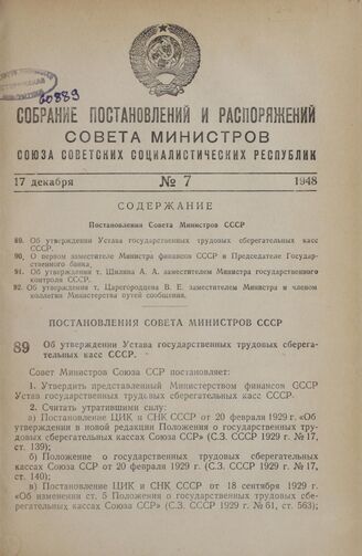 Постановление Совета Министров СССР. Об утверждении Устава государственных трудовых сберегательных касс СССР. 20 ноября 1948 г. № 4339