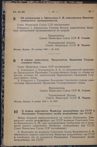 Постановление Совета Министров СССР. Об утверждении т. Афанасьева С. И. заместителем Министра авиационной промышленности. 29 октября 1948 г. № 4058
