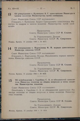 Постановление Совета Министров СССР. Об освобождении т. Скробова С. А. от обязанностей заместителя Министра геологии по общим вопросам и члена коллегии Министерства геологии. 15 декабря 1948 г. № 4624
