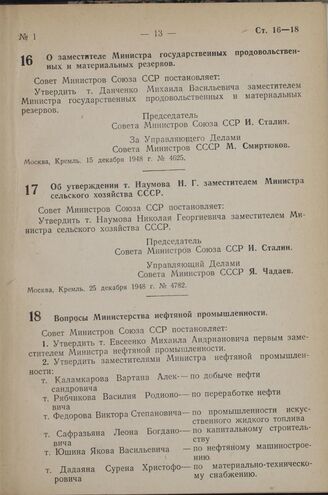 Постановление Совета Министров СССР. Об утверждении т. Наумова Н. Г. заместителем Министра сельского хозяйства СССР. 25 декабря 1948 г. № 4782