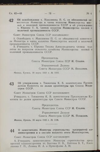 Постановление Совета Министров СССР. Об утверждении т. Токмачева К. В. заместителем Председателя Комитета по делам архитектуры при Совете Министров СССР. 19 марта 1949 г. № 1136