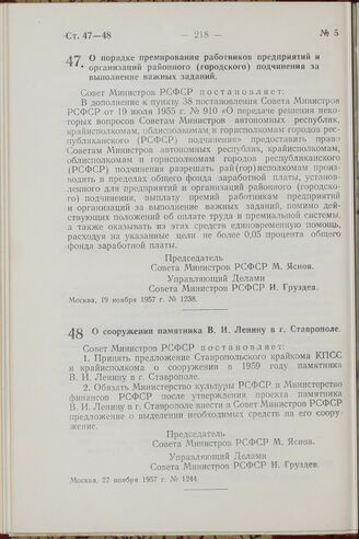 Постановление Совета Министров РСФСР. О порядке премирования работников предприятий и организаций районного (городского) подчинения за выполнение важных заданий. 19 ноября 1957 г. № 1238
