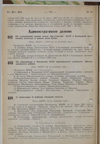 Об установлении границ между Дагестанской АССР и Калмыцкой автономной областью в районе реки Кумы. Пост. ВЦИК и СНК от 20 сентября 1930 г.