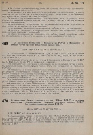 Об изменении Положения о Наркомтруде РСФСР и Положения об отделах труда краевых (областных) исполкомов. Пост. ВЦИК и СНК от 10 августа 1930 г.