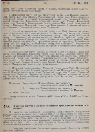 Постановление Всероссийского центрального исполнительного комитета. О составе округов и районов Ивановской промышленной области и их центрах.10 июня 1929 г.