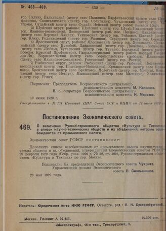 Постановление Экономического совета. О включении Русско-германского общества «Культура и Техника» в список научно-технических обществ и их объединений, которые освобождаются от промыслового налога. 22 мая 1929 г.