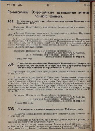Постановление Всероссийского центрального исполнительного комитета. О дополнении постановления Президиума Всероссийского центрального исполнительного комитета от 15 марта 1926 года о преобразовании рабочих поселков Раменское и Наро-фоминское в гор...
