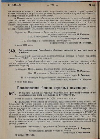 Постановление Совета народных комиссаров. О порядке вывоза за границу любительских фото-кино-снимков и неиспользованных фото-кино-пленок и фотопластинок. 12 июля 1929 г.