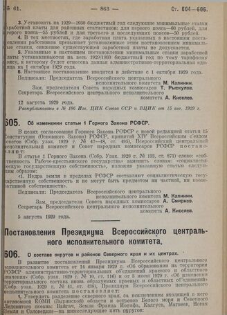 Постановление Всероссийского центрального исполнительного комитета и Совета народных комиссаров. Об изменении статьи 1 Горного Закона РСФСР. 5 августа 1929 г.