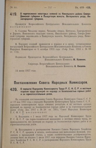 Постановление Совета Народных Комиссаров. О передаче Народному Комиссариату Труда Р.С.Ф.С.Р. и местным отделам труда функций по надзору за безопасностью горных работ и за горноспасательным делом. 25 июня 1927 г.