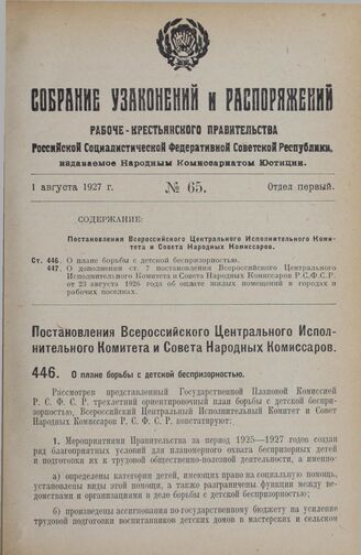 Собрание узаконений и распоряжений Рабоче-Крестьянского правительства РСФСР за 1927 г. № 55-124. Отдел первый. — М., Б. г.