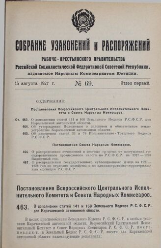Постановление Всероссийского Центрального Исполнительного Комитета и Совета Народных Комиссаров. О дополнении статей 141 и 168 Земельного Кодекса Р.С.Ф.С.Р. для Карачаевской автономной области. 27 июня 1927 г.