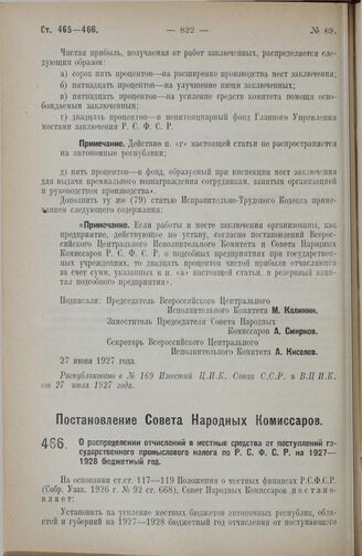 Постановление Совета Народных Комиссаров. О распределении отчислений в местные средства от поступлений государственного промыслового налога по Р.С.Ф.С.Р. на 1927-1928 бюджетный год. 8 июля 1927 г. // Распубликовано в № 166 Известий Ц.И.К. Союза С.С.Р. и В.Ц.И.К. от 23 июля 1927 г.