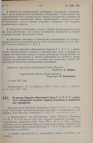 Постановление Совета Народных Комиссаров. По докладу Народного Комиссариата Труда Р.С.Ф.С.Р. о результатах обследования состояния трудовой дисциплины в государственных учреждениях. 13 июля 1927 г.