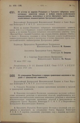 Постановление Всероссийского Центрального Исполнительного Комитета и Совета Народных Комиссаров. Об утверждении Положения о порядке привлечения населения к трудовой и транспортной повинности. 18 июля 1927 г.