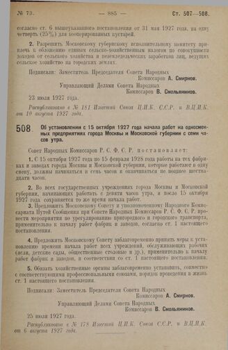 Постановление Совета Народных Комиссаров. Об установлении с 15 октября 1927 года начала работ на односменных предприятиях города Москвы и Московской губернии с семи часов утра. 25 июля 1927 г.