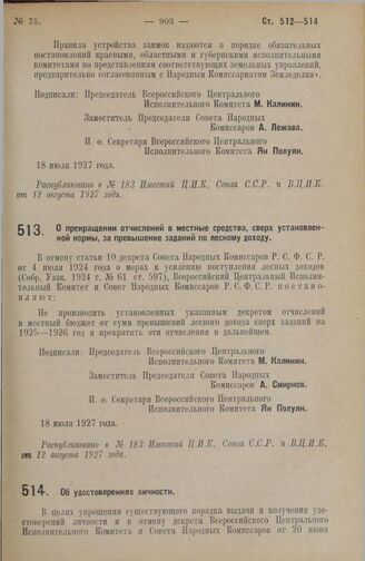 Постановление Всероссийского Центрального Исполнительного Комитета и Совета Народных Комиссаров. О прекращении отчислений в местные средства, сверх установленной нормы, за превышение заданий по лесному доходу. 18 июля 1927 г.