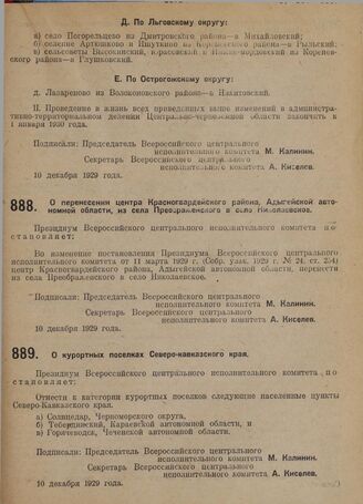 Постановление Всероссийского центрального исполнительного комитета. О перенесении центра Красногвардейского района, Адыгейской автономной области, из села Преображенского в село Николаевское. 10 декабря 1929 г.