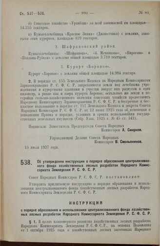 Постановление Совета Народных Комиссаров. Об утверждении инструкции о порядке образования централизованного фонда хозяйственных лесных разработок Народного Комиссариата Земледелия Р.С.Ф.С.Р. 20 июля 1927 г.