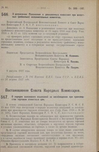 Постановление Всероссийского Центрального Исполнительного Комитета и Совета Народных Комиссаров. О дополнении Положения о ревизионных комиссиях при волостных (районных) исполнительных комитетах. 8 августа 1927 г. // Распубликовано в № 196 Известий Ц.И.К. Союза С.С.Р. и В.Ц.И.К. от 28 августа 1927 г.