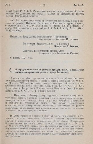 Постановление Всероссийского Центрального Исполнительного Комитета и Совета Народных Комиссаров. О порядке исчисления и размерах арендной платы с арендаторов муниципализированных домов в городе Ленинграде. 6 декабря 1927 года