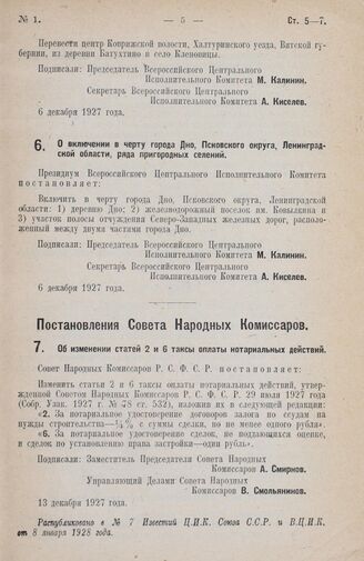 Постановление Всероссийского Центрального Исполнительного Комитета. О включении в черту города Дно, Псковского округа, Ленинградской области, ряда пригородных селений. 6 декабря 1927 года