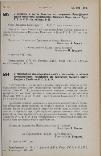Постановление Совета Народных Комиссаров. О введении в состав Комитета по сооружению Волго-Донской водной магистрали представителя Народного Комиссариата Труда Р.С.Ф.С.Р. тов. Иванова, В.И. 5 августа 1927 г.