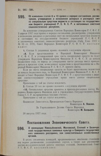Постановление Совета Народных Комиссаров. Об изменении статей 8 и 10 правил о порядке составления, рассмотрения, утверждения и исполнения доходных и расходных смет по специальным средствам ведомств и состоящих на государственном бюджете учреждений...