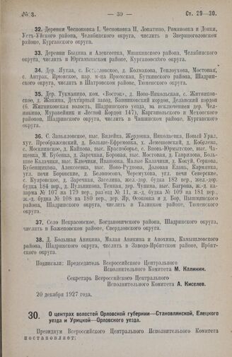 Постановление Всероссийского Центрального Исполнительного Комитета. О центрах волостей Орловской губернии - Становлянской, Елецкого уезда и Урицкой - Орловского уезда. 20 декабря 1927 года