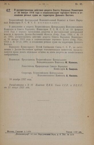 Постановление Всероссийского Центрального Исполнительного Комитета и Совета Народных Комиссаров. О распространении действия декрета Совета Народных Комиссаров от 26 января 1918 года о национализации торгового флота в отношении речных судов на терр...