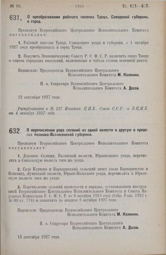 Постановление Всероссийского Центрального Исполнительного Комитета. О преобразовании рабочего поселка Троцк, Самарской губернии, в город. 12 сентября 1927 г.